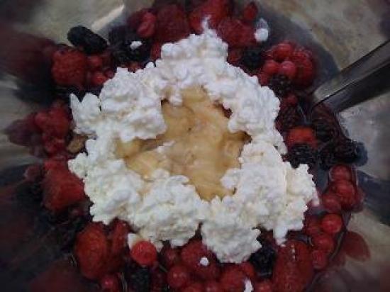 Morgonens frukost, havregryn, banan, keso och bà r